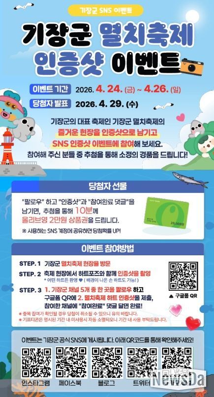 이번 이벤트는 기장군을 대표하는 축제인 기장멸치축제를 찾는 관광객들이 보다 즐겁게 축제를 체험하고, 기장군 공식 SNS 채널을 통해 군정 소식을 보다 친근하게 접할 수 있도록 기획됐다.