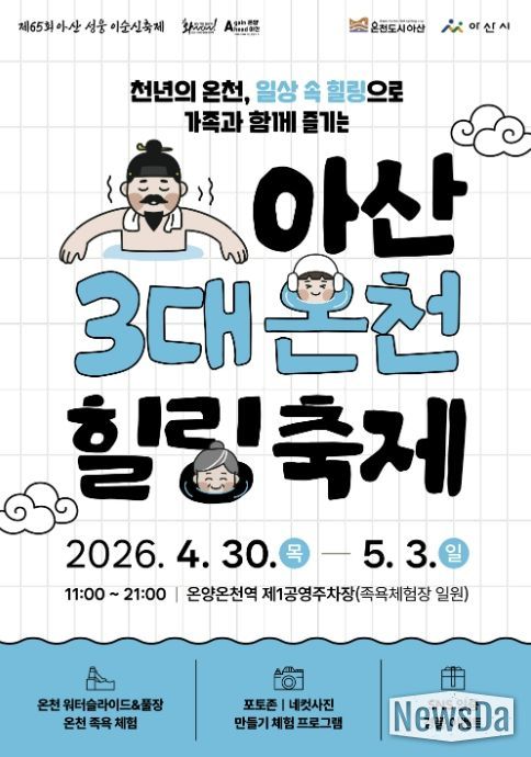 뉴스다 최광묵 기자 | 아산시가 ‘제65회 아산 성웅 이순신 축제’와 연계해 오는 4월 30일부터 5월 3일까지 체험‧홍보형 관광 프로그램인 ‘아산 3대 온천힐링축제’를 함께 진행한다.