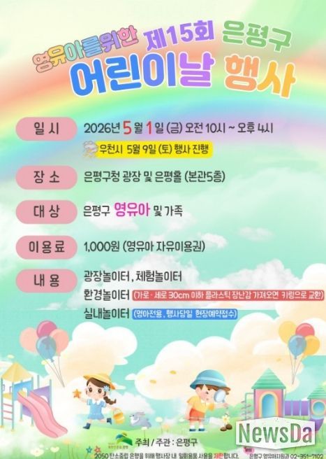 뉴스다 최광묵 기자 | 서울 은평구는 어린이날을 맞아 내달 1일 은평구청 광장과 은평홀에서 ‘제15회 영유아를 위한 어린이날 행사’를 개최한다고 밝혔다.