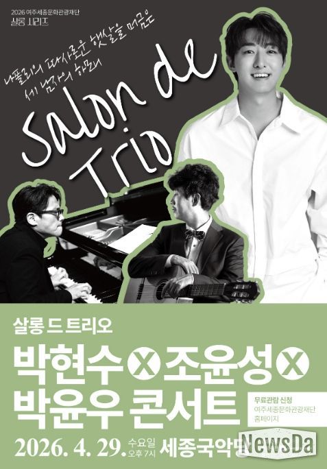 뉴스다 최광묵 기자 | 여주세종문화관광재단이 오는 29일, 문화가 있는 날을 맞아 2026년 특별기획 살롱 시리즈의 세 번째 무대 '살롱 드 트리오 박현수X조윤성X박윤우 콘서트'를 세종국악당에서 개최한다.