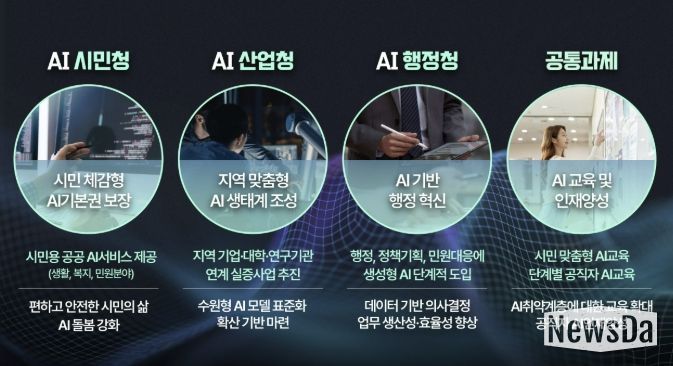 ‘시민 모두의 인공지능 기본권 실현’, ‘인공지능 산업생태계 조성’, ‘인공지능 기반 행정 혁신’을 3대 목표로 설정하고, ▲인공지능(AI) 시민청 ▲인공지능(AI) 산업청 ▲인공지능(AI) 행정청 ▲인공지능 교육·인재 양성으로 분야를 나눠 인공지능 기반 사업을 추진한다.