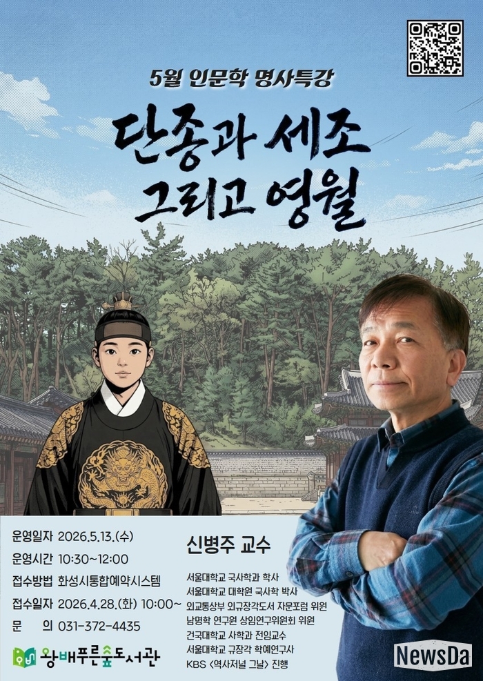 화성시문화관광재단(대표이사 안필연) 운영하는 왕배푸른숲도서관이 오는 5월 13일(수), 지역 주민들을 위해 역사학자 신병주 교수를 초청하여 5월 인문학 명사특강을 개최한다.