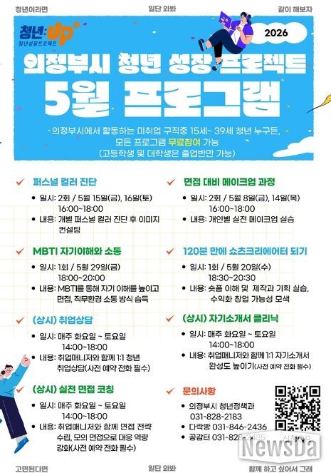 뉴스다 최광묵 기자 | 의정부시는 미취업 청년의 취업 준비 역량 강화를 위해 ‘청년성장프로젝트’ 5월 프로그램을 운영한다.