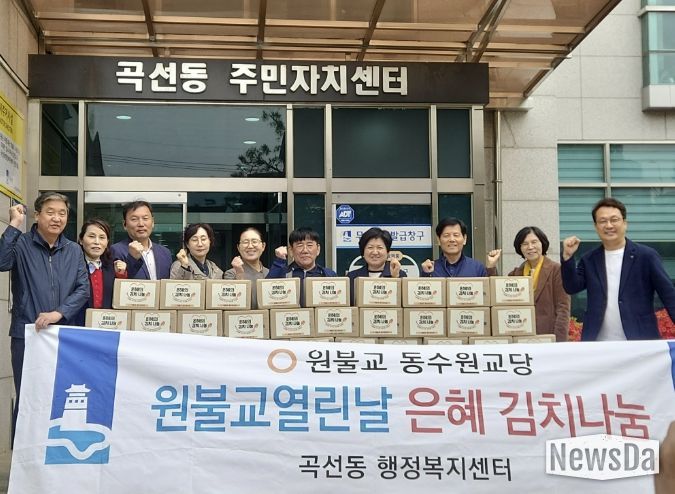 뉴스다 최광묵 기자 | 원불교 동수원교당은 지난 22일 수원시 권선구 곡선동 행정복지센터에서 봄맞이 ‘은혜김치 나눔’ 전달 행사를 개최하고, 정성껏 담근 김치 30박스를 곡선동에 전달했다.