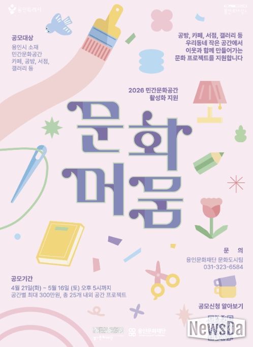 뉴스다 최광묵 기자 | 용인문화재단은 오는 5월 16일까지 ‘민간문화공간 활성화 지원사업 '문화머뭄'’의 참여 공간을 모집한다고 밝혔다. 지난해 25개소 공간에서 203회의 프로그램을 운영하며 2,101명의 시민 참여를 이끌어낸 ‘문화머뭄’ 사업은 올해 재단 자체 재원을 매칭하여 총 25개소의 민간문화공간을 선정하고, 공간별 최대 300만 원까지 프로젝트 운영비를 지원할 예정이다.