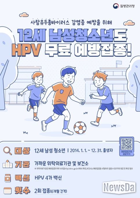 기존에는 여성청소년과 일부 저소득층 여성에게 제공되던 무료 접종이 12세 남성 청소년(2014년생) 대상으로 총 2회(6개월 간격) 무료 접종을 시작한다.