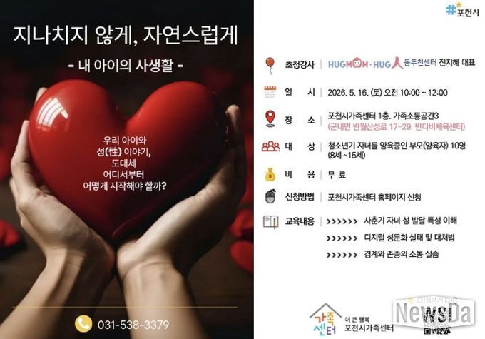 뉴스다 최광묵 기자 | 포천시 직영 더 큰 행복 포천시가족센터는 오는 21일부터 사춘기 자녀를 둔 양육자를 대상으로 부모 교육 프로그램 ‘지나치지 않게, 자연스럽게’의 참여자를 모집한다. 이번 교육은 5월 16일 오전, 포천시가족센터 가족소통공간(반다비체육센터 1층)에서 대면 강의로 진행된다.