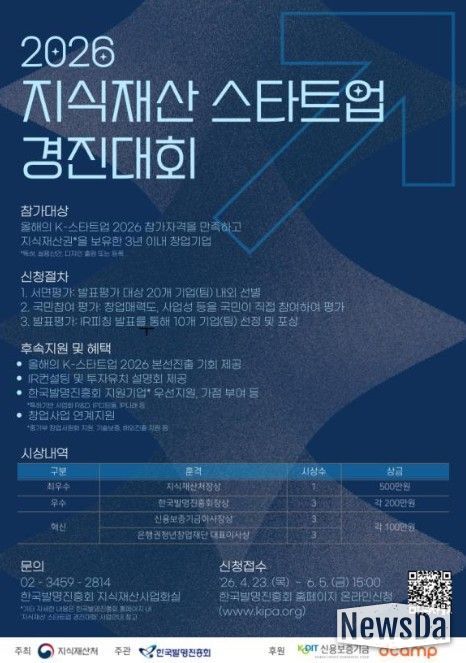 뉴스다 최광묵 기자 | 지식재산처는 신용보증기금, 은행권청년창업재단(디캠프), 한국발명진흥회와 함께 4월 23일 ~ 6월 5일까지'2026 지식재산 스타트업 경진대회'참가기업을 모집한다고 밝혔다.