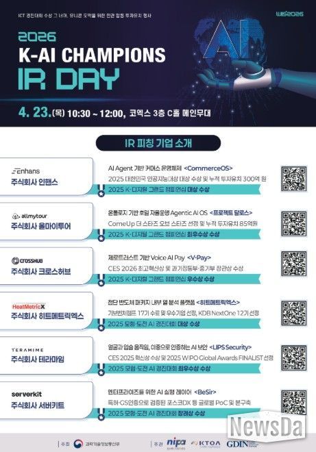뉴스다 최광묵 기자 | 과학기술정보통신부는 정보통신산업진흥원, 한국통신사업자연합회와 함께 4월 23일 서울 코엑스에서 ‘2026 K-AI Champions IR Day’을 개최했다고 밝혔다.