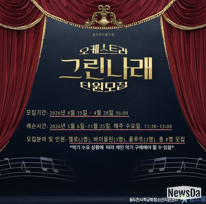 뉴스다 최광묵 기자 | 동두천시학교밖청소년지원센터는 2026년을 맞아 학교 밖 청소년을 대상으로 ‘그린나래 오케스트라’ 신규 단원을 모집한다고 밝혔다.