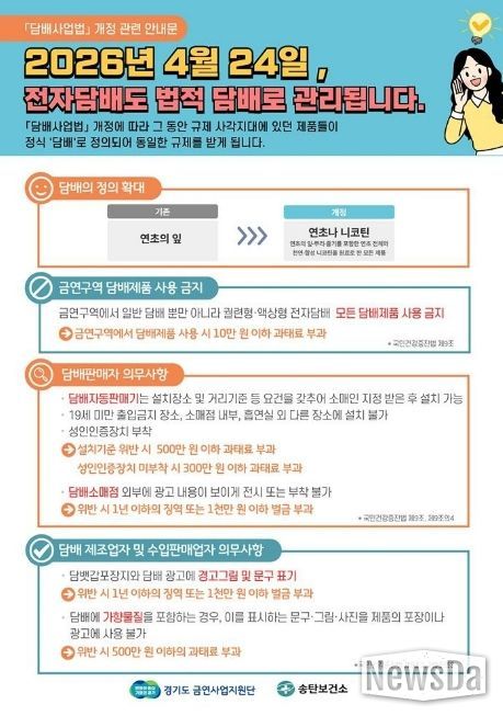 뉴스다 최광묵 기자 | 평택시는 2026년 4월 24일부터 시행되는 개정 '담배사업법'에 따라 전자담배를 포함한 모든 니코틴 제품이 ‘담배’로 규정되며, 금연구역 내 전자담배 흡연 시 과태료 10만 원이 부과된다고 밝혔다.
