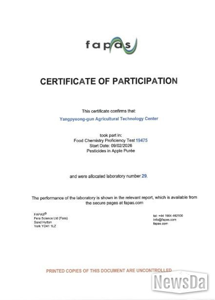 뉴스다 최광묵 기자 | 양평군은 영국 식품환경연구청(FERA)이 주관한 ‘2026년 잔류농약 국제비교숙련도 평가’에서 최고 수준의 분석능력을 인정받아 3년 연속 우수성을 입증했다고 21일 밝혔다.
