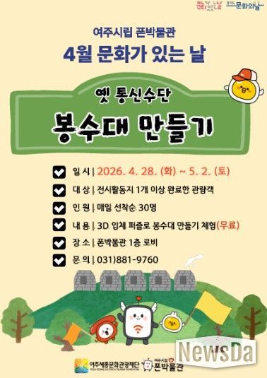 뉴스다 최광묵 기자 | 여주세종문화관광재단이 운영하는 여주시립 폰박물관은 4월 '문화가 있는 날'을 맞아 오는 4월 28일부터 5월 2일까지 시민 참여형 체험 행사 '소식을 전하던 봉수대 만들기'를 운영한다.