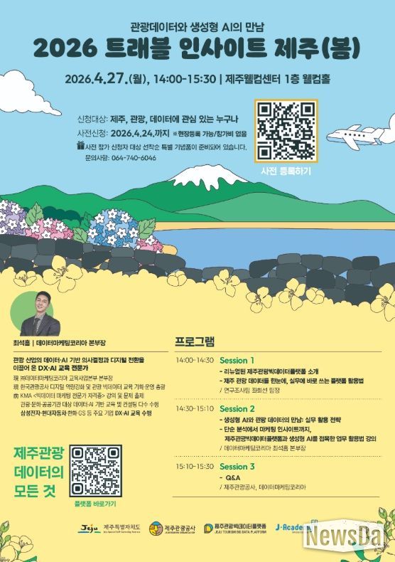 뉴스다 최광묵 기자 | 제주특별자치도와 제주관광공사(사장 고승철)는 오는 27일 제주웰컴센터에서 관광사업체, 공공기관, 학계 등 관광과 데이터에 관심 있는 분들을 대상으로 데이터 기반 의사결정을 지원하기 위한 ‘2026 트래블 인사이트 제주(봄)’ 세미나를 개최한다고 23일 밝혔다. 이번 세미나에선 새롭게 개편한 제주관광 빅데이터 플랫폼(data.ijto.or.kr)의 활용 방안을 소개하고, 생성형 인공지능(AI)과 관광데이터를 결합한 실무 활용 전략을 공유한다.