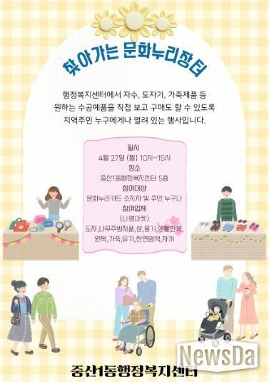 뉴스다 최광묵 기자 | 고양특례시 일산동구 중산1동은 오는 4월 27일 오전 10시부터 오후 3시까지 센터 5층 다목적실에서 ‘찾아가는 문화누리장터’를 개최한다.