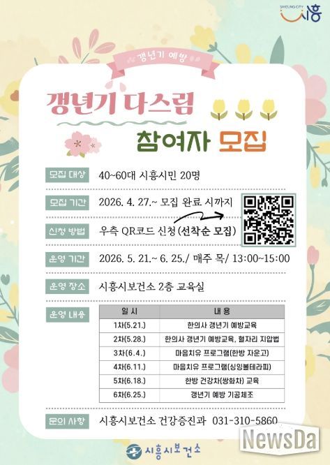 뉴스다 최광묵 기자 | 시흥시보건소는 올해부터 한의약 건강증진사업을 시범으로 운영하고, 40~60대 시흥시민을 대상으로 갱년기 신체ㆍ정신 건강관리를 지원하는 한의약 건강증진 프로그램 ‘갱년기 다스림’ 참여자를 모집한다.