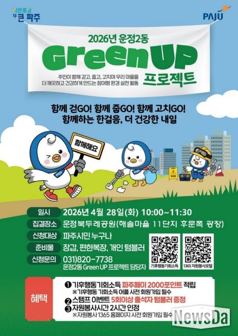 뉴스다 최광묵 기자 | 파주시 운정2동은 오는 28일 10시부터 운정 북두레공원에서 주민과 함께하는 시민 참여형 환경·건강 프로그램 ‘제3회 그린 업(Green UP) 프로젝트’를 개최한다.