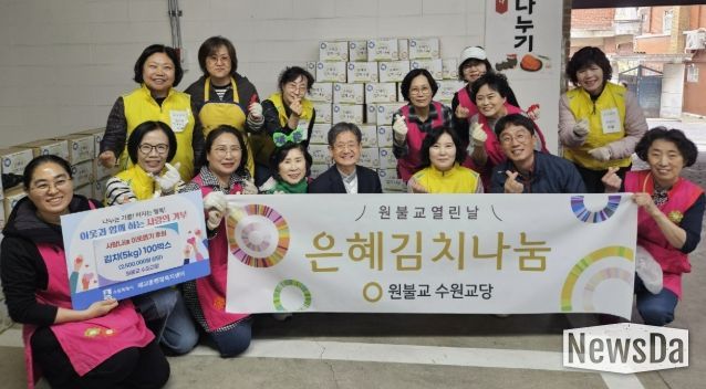 뉴스다 최광묵 기자 | 수원시 팔달구 매교동은 지난 22일, 원불교 수원교당(교구장 김도천)으로부터 직접 담근 배추김치(5kg) 100박스를 기부받았다고 밝혔다.