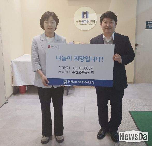 뉴스다 최광묵 기자 | 수원시 영통구 영통2동은 지난 23일 수원꿈꾸는교회가 지역사회 내 취약계층 지원을 위해 교인들과 함께 모금한 사랑의 성금 1천만원을 영통2동 행정복지센터에 기부했다고 밝혔다.