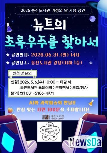 뉴스다 최광묵 기자 | 김포시 통진도서관이 가정의 달을 맞아 온 가족이 함께 즐길 수 있는 공연 '뉴트의 초록우주를 찾아서'를 오는 5월 31일 오후 2시 통진도서관 강당에서 개최한다.