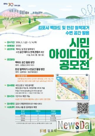 뉴스다 최광묵 기자 | 김포시가 한강 철책 제거 부지와 백마도 등 천혜의 수변 자원을 시민들의 쉼터와 문화 공간으로 탈바꿈하기 위해 ‘시민 아이디어 공모전’을 개최한다고 밝혔다. 이번 공모전은 ‘김포시 백마도 및 한강 철책 제거 수변 공간 활용’을 주제로, 시민들의 창의적이고 실효성 있는 아이디어를 발굴해 시정 운영에 적극 반영하기 위해 마련됐다.