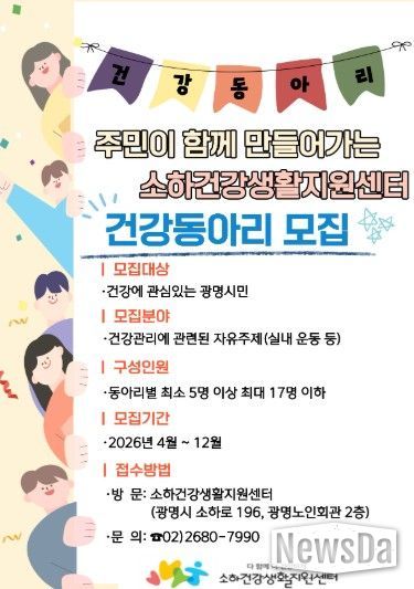 뉴스다 최광묵 기자 | 광명시 소하건강생활지원센터가 시민 스스로 건강을 관리하고 실천하도록 돕기 위해 오는 12월까지 ‘주민참여형 건강동아리’를 상시 모집한다.