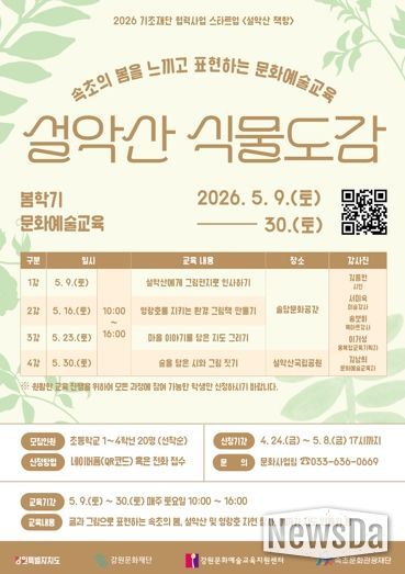이태훈 사무국장은 “설악산 식물도감을 통해 우리 지역 어린이들이 수려한 자연환경 속에서 글과 그림으로 봄이라는 계절을 자유롭게 표현해 보는 경험을 하길 기대한다”며 “지역적 요구에 부응하는 지역 특성화 문화예술교육 시스템 구축을 위해 강원특별자치도, 강원문화재단, 강원문화예술교육지원센터와 함께 지속적으로 확대해 나가겠다”고 밝혔다.