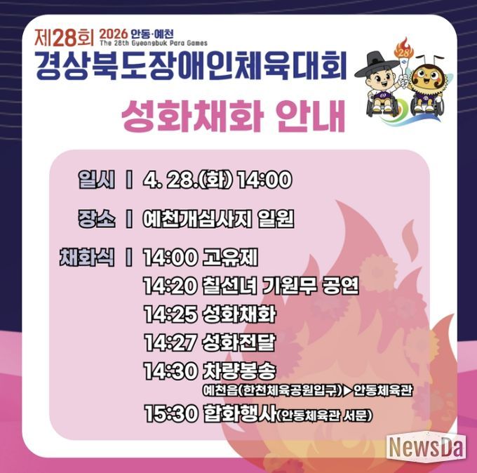 뉴스다 최광묵 기자 | 예천군은 오는 28일, 예천과 안동이 공동으로 주관하는 ‘제28회 경상북도장애인체육대회’의 시작을 알리는 성화 채화식을 예천 개심사지에서 개최한다.