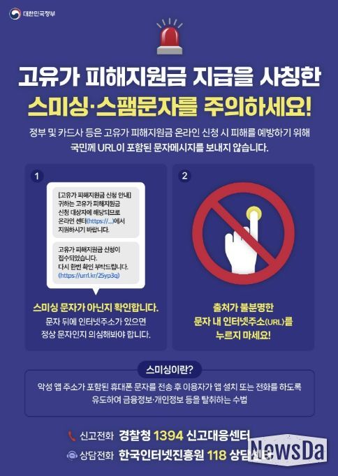 한편, 시는 ‘고유가 피해지원금 지급’을 사칭한 스미싱 문자에 대해 각별한 주의를 당부했다. 고유가 피해지원금은 카드사 또는 지역화폐 공식 앱이나 누리집(홈페이지), 오프라인에서만 신청이 가능하다. 특히 공공기관에서는 고유가 피해지원금과 관련된 인터넷 주소(URL) 링크 연결을 유도하는 문자를 보내거나 전화하지 않는다고 강조했다.