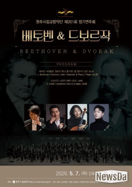뉴스다 최광묵 기자 | 원주시립교향악단 제201회 정기연주회가 오는 5월 7일 오후 7시 30분 백운아트홀에서 개최된다. 이번 연주회에는 지휘자 조규진과 바이올리니스트 김남훈, 첼리스트 홍승아, 피아니스트 신효건이 협연자로 나서 베토벤 3중 협주곡 C장조와 드보르작 교향곡 제8번 G장조를 선보일 예정이다.