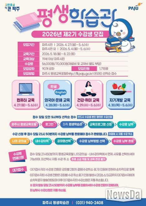 뉴스다 최광묵 기자 | 파주시 평생학습관은 시민의 평생학습 기회를 확대하기 위해 '2026년 제2기 정규강좌’수강생을 오는 4월 27일부터 5월 6일까지 모집한다.