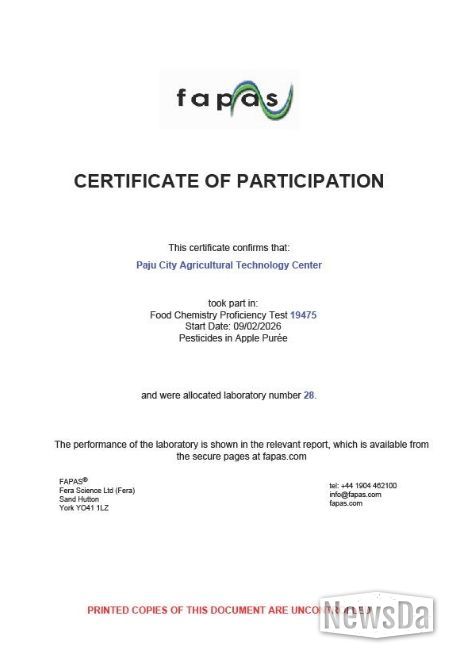 뉴스다 최광묵 기자 | 파주시 농산물 안전분석실이 국제적으로 공신력 있는 잔류농약 분석 능력 평가에서 4년 연속 우수한 결과를 달성하며 세계 수준의 분석 역량을 입증했다.