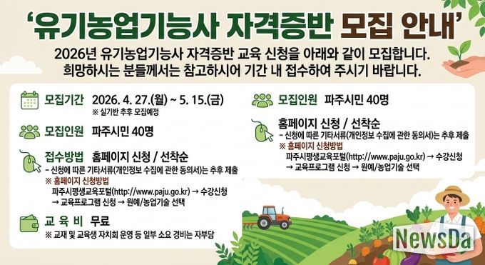 뉴스다 최광묵 기자 | 파주시농업기술센터는 친환경농업 분야 농업 전문 인력 육성을 위한 '2026년 유기농업기능사 자격증 취득’교육생을 4월 27일부터 5월 15일까지 모집한다.