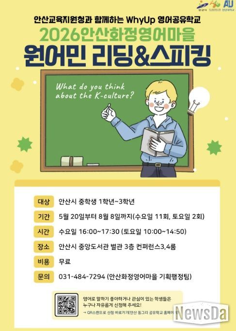 이번 프로그램은 ‘안산 동그리 공유학교’를 기반으로 운영되는 WhyUp 영어공유학교 사업의 일환으로 추진된다. 참가 신청은 27일 오전 9시부터 오는 30일 오후 6시까지 경기공유학교 누리집에서 온라인으로 하면 된다.