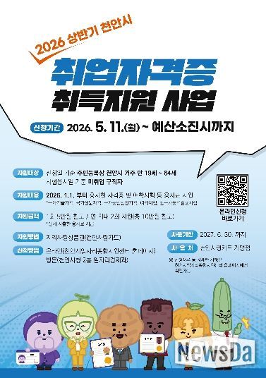 뉴스다 최광묵 기자 | 천안시가 구직자의 경제적 부담을 완화하고 취업 역량 강화를 돕기 위해 ‘2026년 상반기 취업자격증 취득지원 사업’ 참가자를 모집한다고 27일 밝혔다.