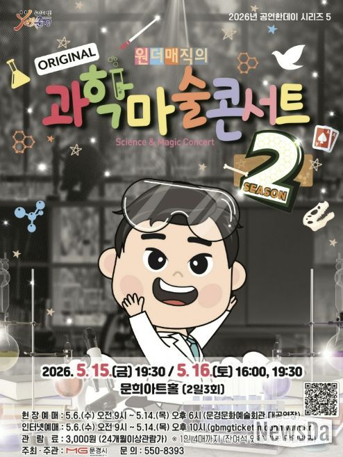 뉴스다 최광묵 기자 | 문경문화예술회관에서는 5월 어린이 달을 맞아 마술과 과학의 경계를 넘나들며 온가족 모두가 재미있게 관람할 수 있는 과학마술콘서트 시즌2 공연을 5월 15일 19:30, 16 16:00, 19:30 (2일 3회)에 문희아트홀에서 개최한다.