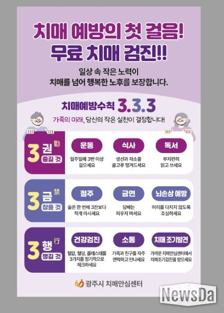뉴스다 최광묵 기자 | 광주시치매안심센터는 치매 발병 위험이 높은 고령층을 집중 관리하기 위해 오는 29일부터 30일까지 광주시 스포츠헬스센터에서 ‘치매 조기 검진 및 인식 개선 캠페인’을 실시한다고 27일 밝혔다.