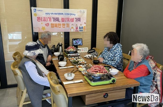 뉴스다 최광묵 기자 | 수원시 장안구 연무동은 지난 24일, 관내 음식점 ‘구운정’에서 지역 취약계층 어르신들을 모시고 ‘온(溫)기 가득, 정(情)성 가득 행복한 한 끼’ 나눔 행사를 진행했다고 밝혔다.