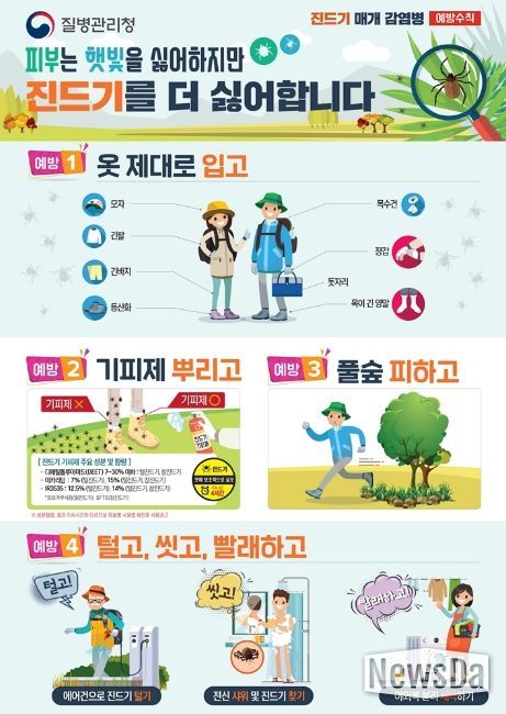 뉴스다 최광묵 기자 | 의정부시 보건소는 따뜻한 날씨로 농작업, 등산, 캠핑 등 야외활동이 본격화됨에 따라 진드기 매개 감염병 예방수칙 준수를 시민들에게 당부했다.