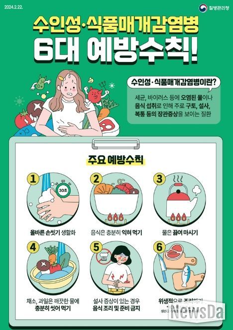 하절기 수인성·식품매개감염병 예방을 위해서는 ▲흐르는 물에 30초 이상 비누로 올바르게 손 씻기 ▲음식은 충분히 익혀 먹기 ▲채소, 과일은 깨끗한 물에 충분히 씻어 먹기 ▲위생적으로 조리하고 설사 증상이 있는 경우 조리에 참여하지 않기 ▲생선·고기·채소 도마 분리 사용 등 예방 수칙을 준수해야 한다.
