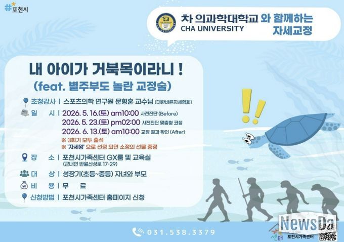뉴스다 최광묵 기자 | 포천시 더 큰 행복 포천시가족센터는 오는 5월 16일부터 6월 13일까지 성장기 자녀를 둔 가족을 대상으로 부모역할지원사업 ‘내 아이가 거북목이라니! feat.별주부도 놀란 교정술’ 프로그램을 운영한다.