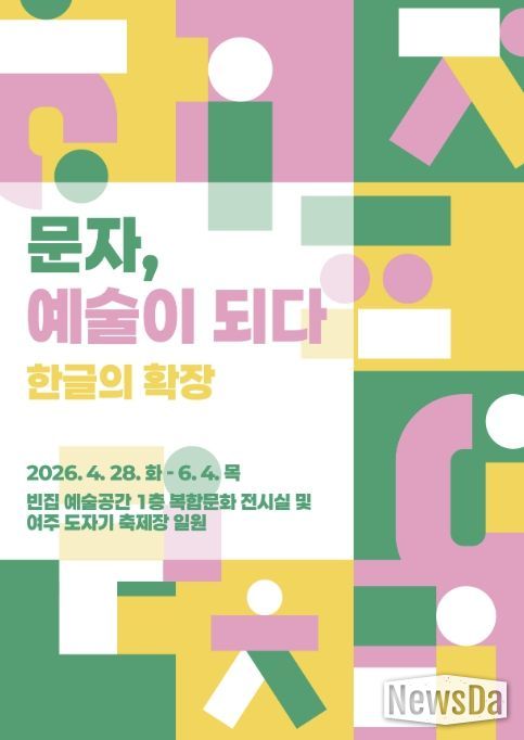 뉴스다 최광묵 기자 | 여주세종문화관광재단은 오는 4월 28일부터 6월 4일까지 빈집 예술공간 1층에서 기획전시 《문자, 예술이 되다 - 한글의 확장》를 개최한다고 밝혔다.
