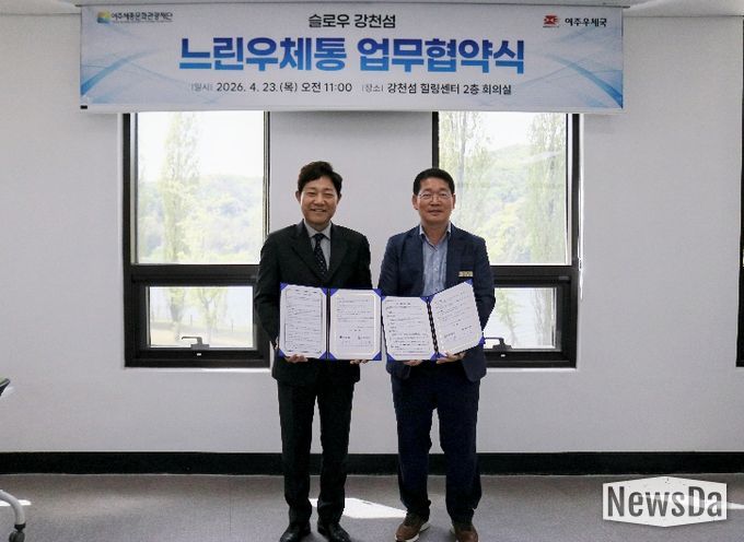 뉴스다 최광묵 기자 | 여주세종문화관광재단과 여주우체국은 4월 23일 강천섬 힐링센터에서 ‘슬로우 강천섬 느린우체통 업무협약(MOU)’을 체결했다. 빠르게 흘러가는 일상 속에서 잠시 걸음을 멈추고, 소중한 사람에게 미래의 마음을 전할 수 있는 감성 관광콘텐츠를 공동으로 운영하기 위해서다.
