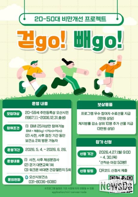 뉴스다 최광묵 기자 | 오산시보건소는 최근 젊은 층의 비만율 증가에 대응해 체질량지수(BMI) 25kg/㎡ 이상인 20~50대 오산시민을 대상으로 걷기 기반 비만 개선 프로그램 ‘걷GO 빼GO’를 운영한다고 밝혔다.