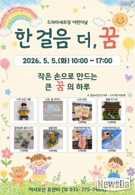 뉴스다 최광묵 기자 | 오산시는 오는 5월 5일 어린이날을 맞아 오산 드라마세트장 일원에서 어린이와 가족이 함께 즐길 수 있는 체험 프로그램 ‘한 걸음 더, 꿈’을 운영한다고 밝혔다.