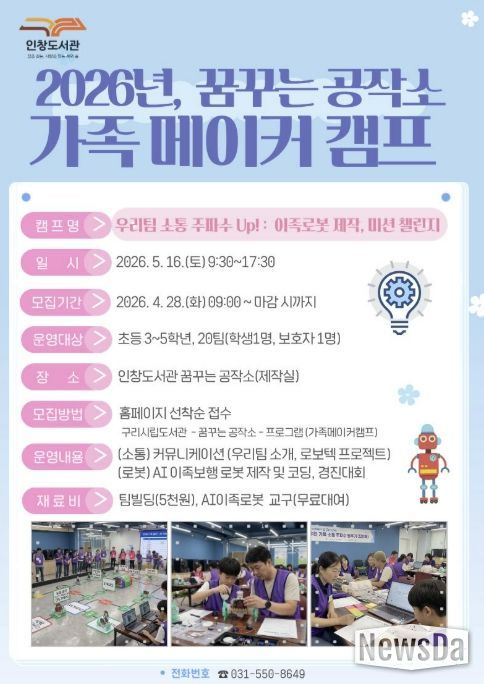 뉴스다 최광묵 기자 | 구리시 인창도서관‘꿈꾸는 공작소’는 오는 5월 16일 초등학생 자녀와 보호자가 함께 참여해 가족 간 유대감을 높이고 인공지능을 체험하는 '우리 팀 소통 주파수 Up! : 이족로봇 제작, 미션 챌린지' 가족 메이커 캠프를 운영한다고 밝혔다.
