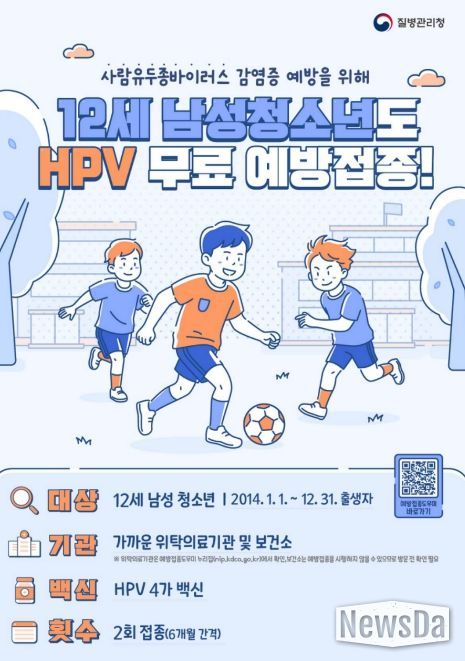 신규 지원 대상은 2014년 1월 1일부터 12월 31일 사이에 출생한 남성 청소년이며, HPV 4가 백신을 6개월 간격으로 총 2회 무료로 접종받을 수 있다.