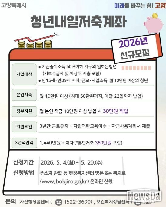 뉴스다 최광묵 기자 | 고양특례시는 5월 4일부터 시작하는 청년내일저축계좌 신규 가입자 모집을 앞두고, 가입 독려에 나섰다.