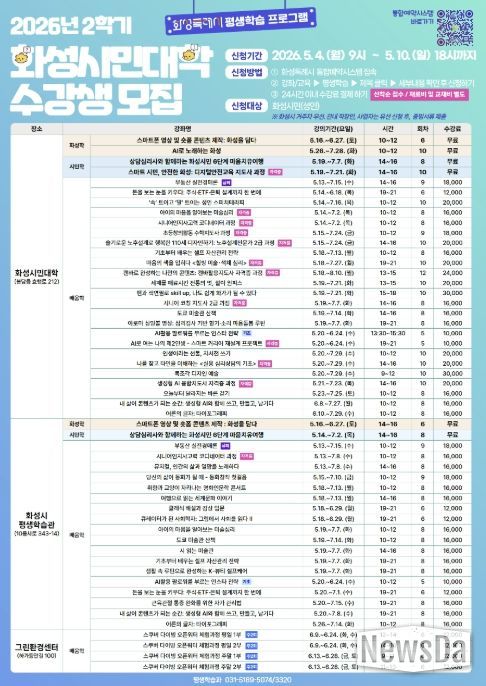 뉴스다 최광묵 기자 | 화성특례시는 2026년 화성시민대학 2학기 수강생을 오는 5월 4일부터 5월 10일까지 선착순으로 모집한다고 밝혔다.