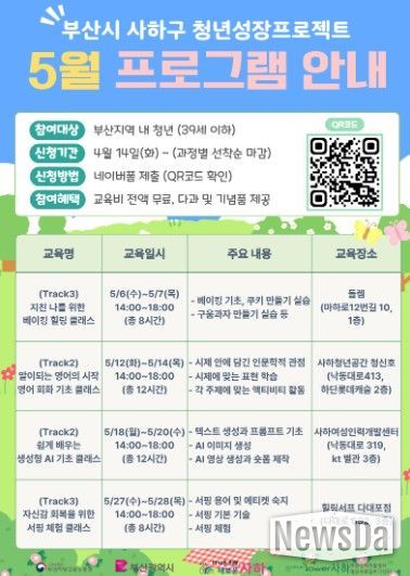 뉴스다 최광묵 기자 | 부산 사하구는 구직 활동에 지친 청년들의 일상 회복과 취업 역량 강화를 위해 '2026년 청년성장 프로젝트' 5월 프로그램 참여자를 선착순 모집한다.